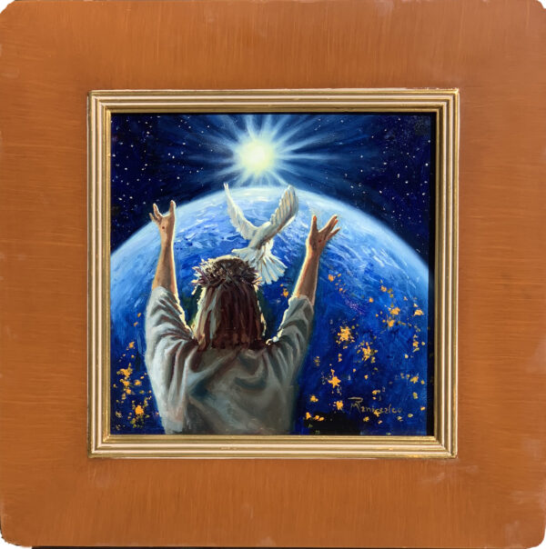 Jesus Sending the Holy Spirit 12×12″ framed by the artist – currently on exhibit at Art and Faith Gallaria.